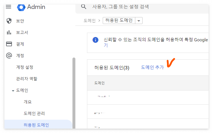 - 각 관리자 - 관리 콘솔 - 계정 - 도메인 - 허용된 도메인 - 타 도메인 추가