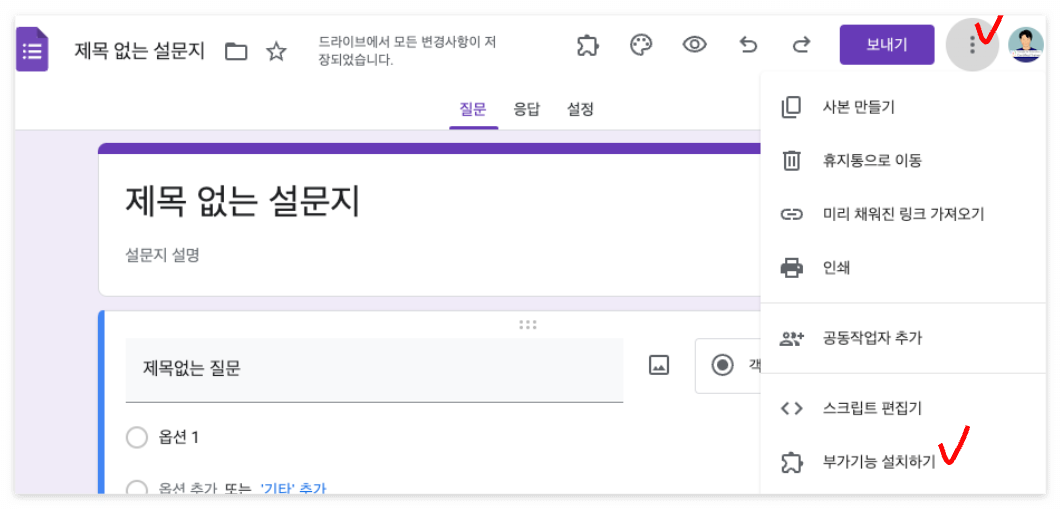 Forms 편집화면 - 우측상단 더보기 메뉴(점점점) - 부가기능 설치하기