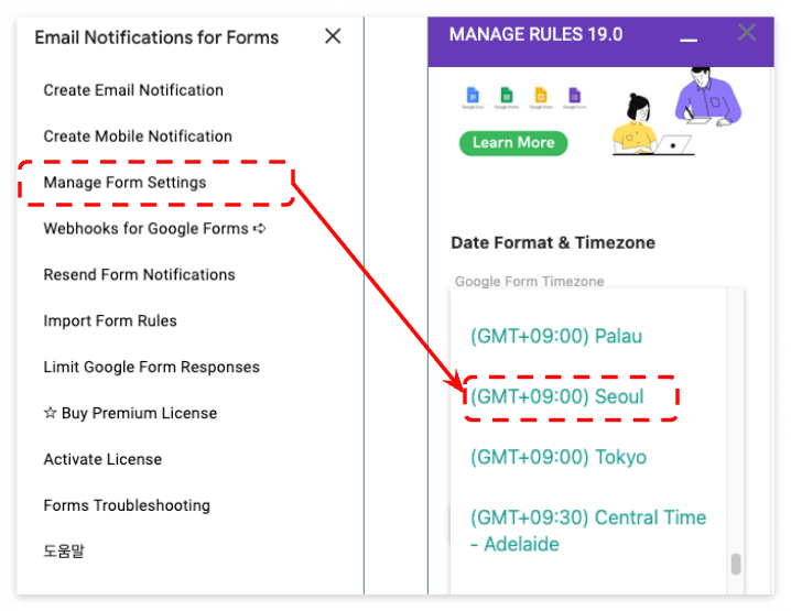 상단 부가기능 - Manage Form Settings - Date Format & Timezone - (GMT+09:00) Seoul 선택후 - UPDATE
