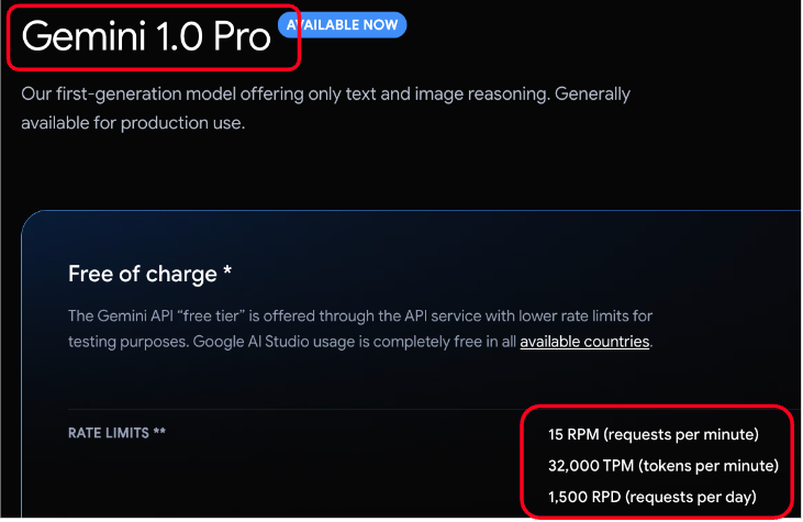 - Gemini 1.0 Pro - 분당 15회 요청, 분당 32k 토큰, 1일 1,500회 요청
