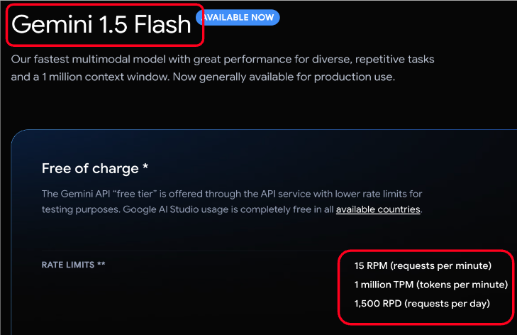 - Gemini 1.5 Flash - 분당 15회 요청, 분당 1M 토큰, 1일 1,500회 요청