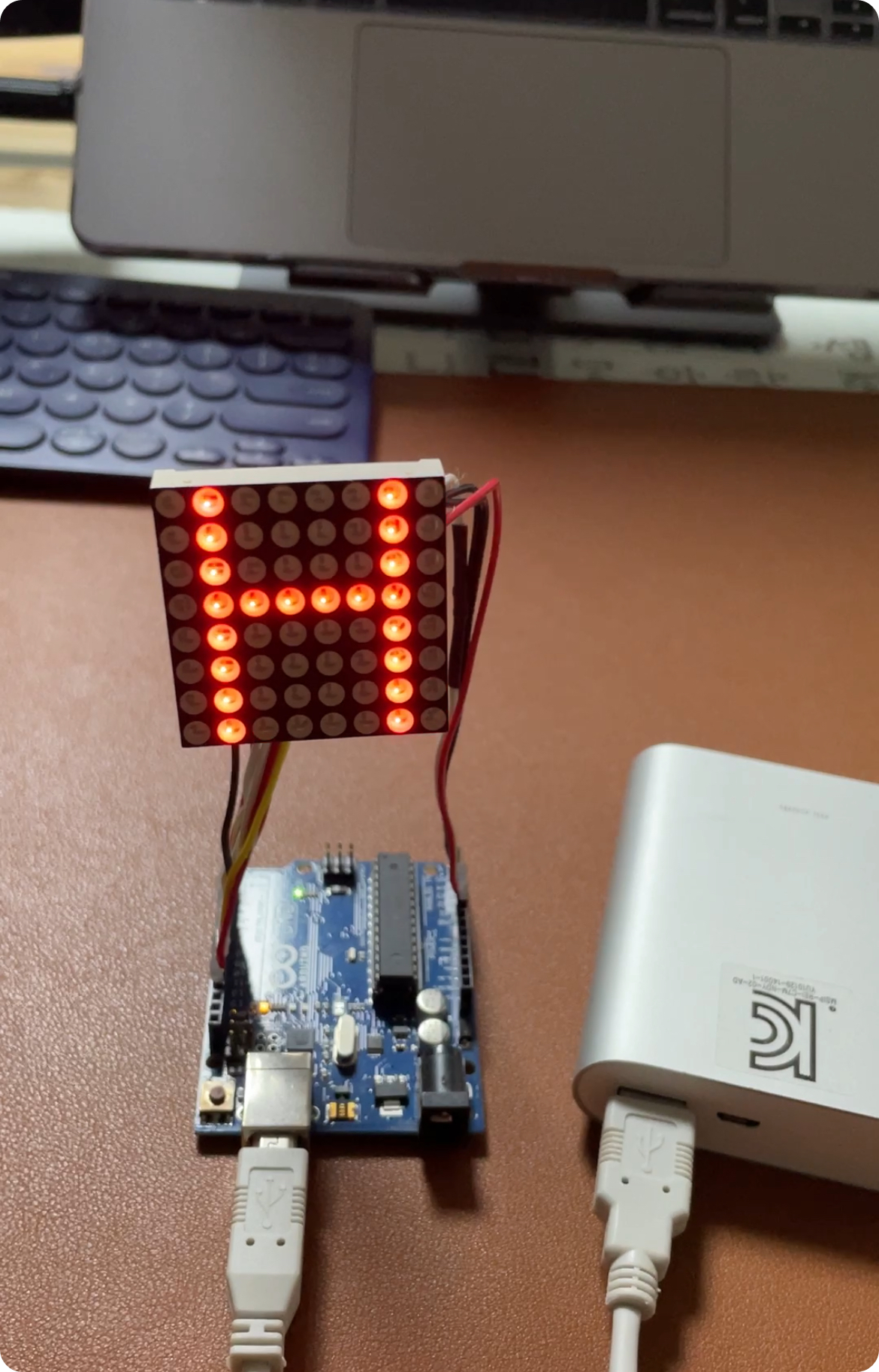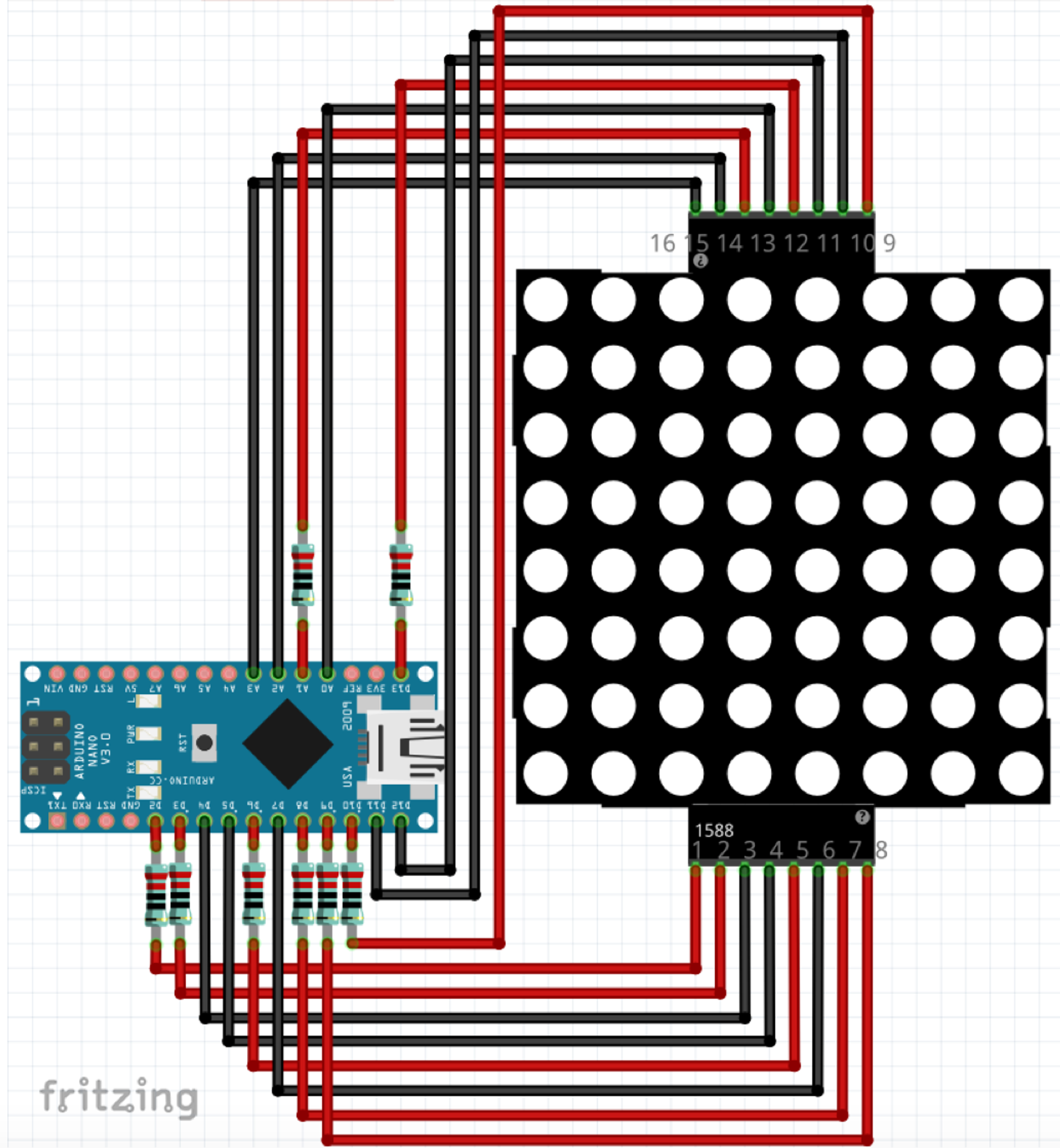 아래 내용은 도트매트리스와 8개의 저항을 이용하여 16개의 핀을 아두이노와 연결하여