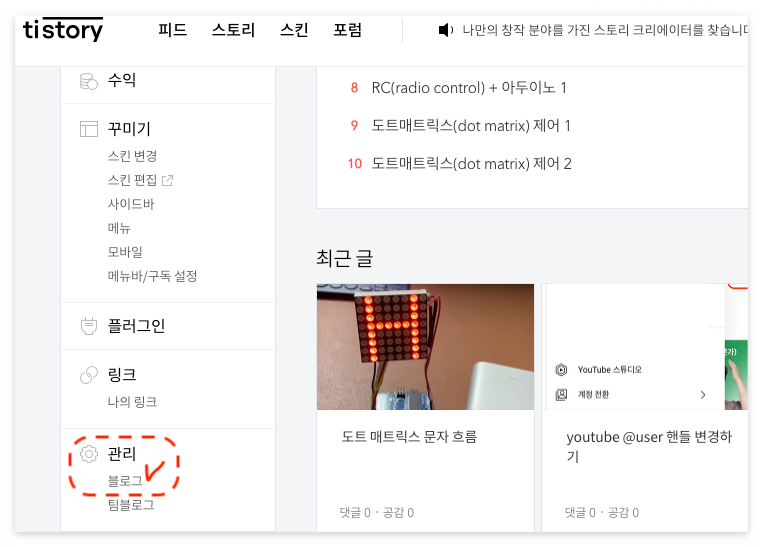 - 자신의 블로그로 이동 → 로그인 → 관리 → 블로그