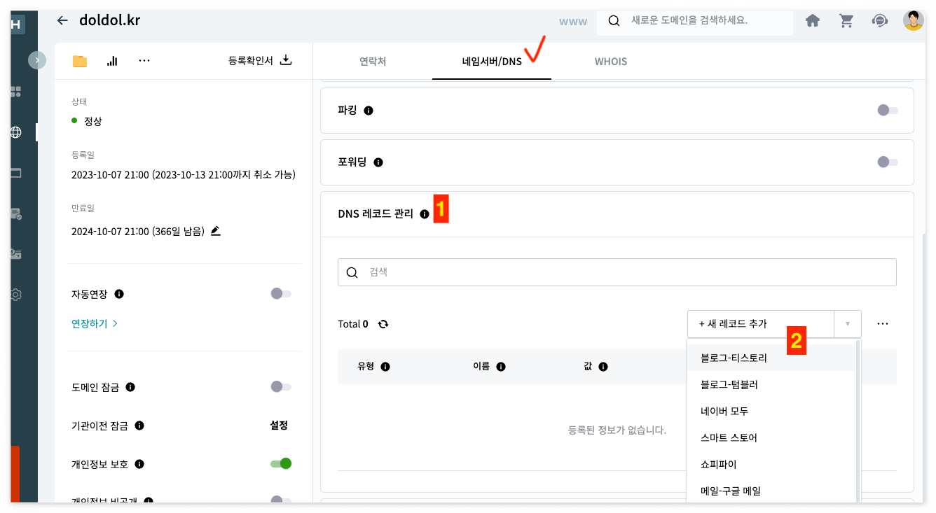 - 상단의 네임서버/DNS → DNS 레코드 관리 → 새 레코드 추가 → 블로그-티스토리 선택 → 저장