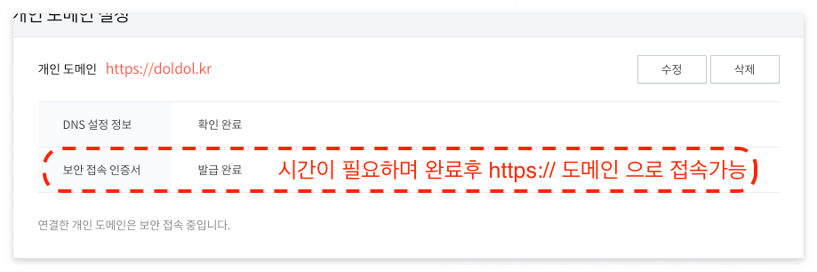 - 개인 도메인 설정 → 구입한 도메인 입력 → 변경사항 저장