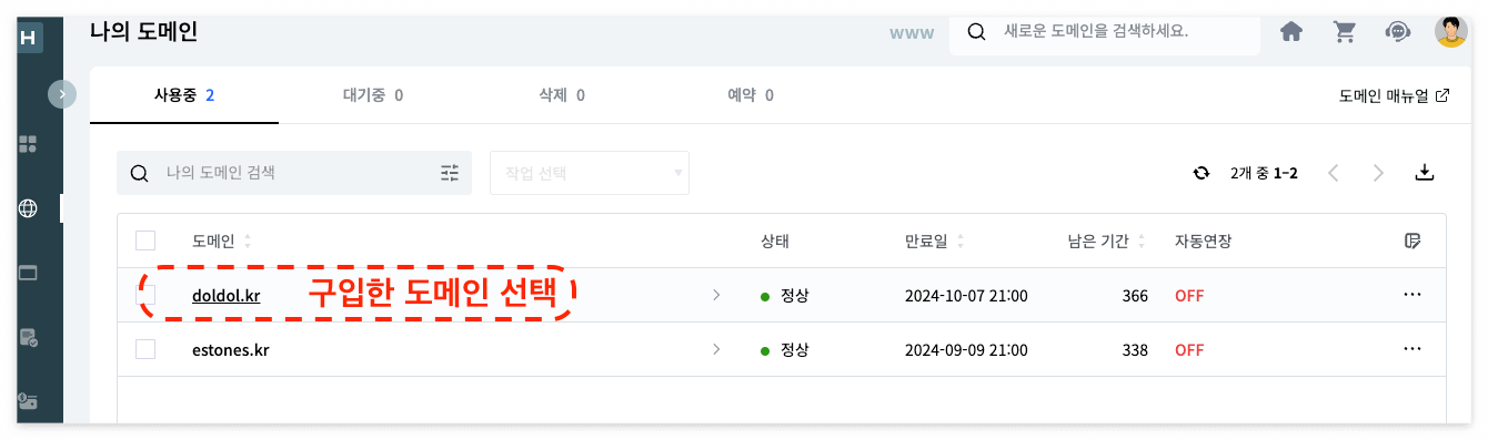 - 호스팅kr 로그인 → 나의 서비스 → 도메인 관리