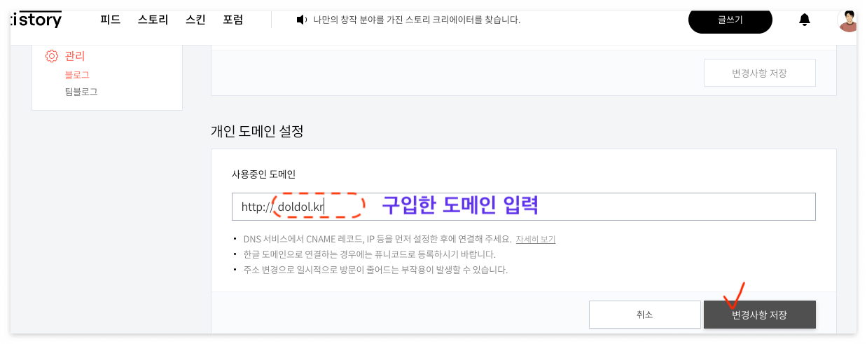블로그 주소를 구입한 개인도메인으로 접속하기